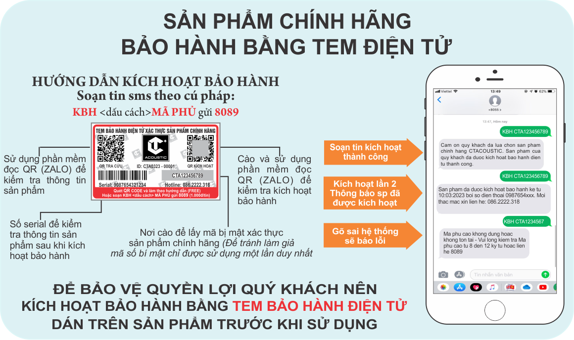 Để đảm bảo quý khách sử dụng sản phẩm chính hãng và được bảo hành sản phẩm.Quý khách vui lòng soạn tin kích hoạt theo hướng dẫn trên TEM BẢO HÀNH dán trên sản phẩm.